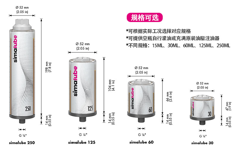 型号规格:有 15ml、30ml、60ml、125ml 和 250ml 五种规格,以满足不同的润滑需求。