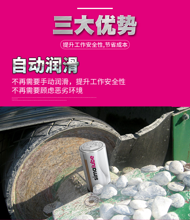 工作原理:Simalube 自动注油器内有一个产生气体的干电池,干电池产生氢气,氢气在注油器的活塞后方积聚,推动活塞,从而将润滑剂自动且均匀地挤出,按照预先设定的量进行持续供应。