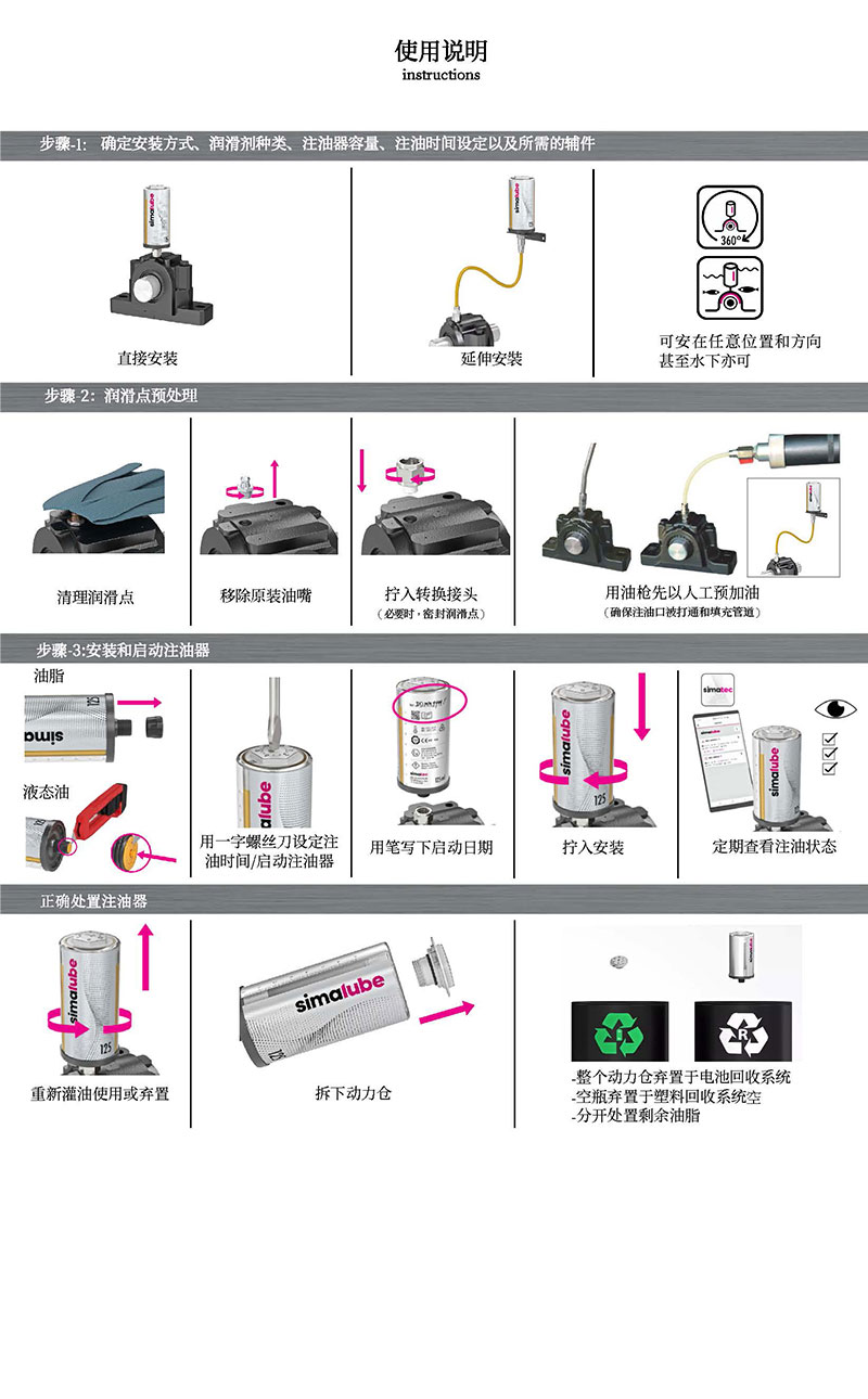 工作原理:Simalube 自动注油器内有一个产生气体的干电池,干电池产生氢气,氢气在注油器的活塞后方积聚,推动活塞,从而将润滑剂自动且均匀地挤出,按照预先设定的量进行持续供应。