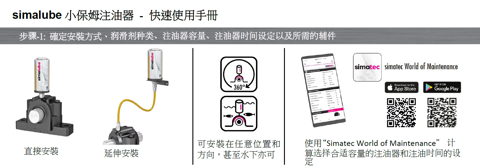 最后,将simalube注油器安装在润滑点上,并确保在注油器瓶口处缠装一些生料带进行密封。对于首次使用的客户,建议定期检查注油器的工作状态,以确保其按时注油。当注油器内的润滑剂用完或设置的时间到期后,需要更换相同规格型号的注油器,或更换动力仓并重新灌油后继续使用。请注意,动力仓属于一次性使用,更换后请妥善处理。