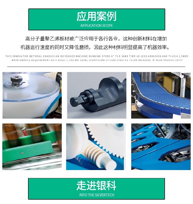 耐磨性能优异:其板材采用的高分子量聚乙烯材料(UHMW-PE)具有出色的耐磨性,拥有普通聚乙烯和其它工程塑料无法比拟的耐磨性能,能有效减少摩擦损耗,延长使用寿命。